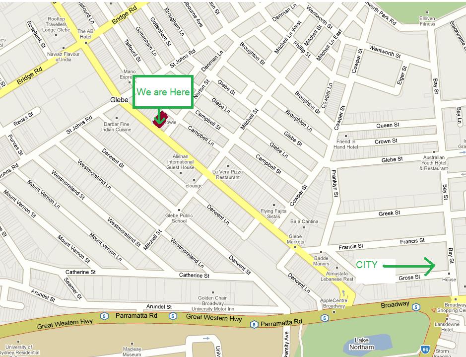 (If you turn on to Glebe Point Road from Parramatta Road near Broadway we are half way up the first hill)